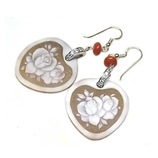This is a pair of shell cameo flower earrings with red coral and sterling silver with cubic zirconia stones, showcasing brilliant glamor. From the selection of raw materials to cutting and carving them into beautiful creations, we pay great attention to each step. Our craftsmen bring together a blend of the old traditional techniques with the new, creating magnificent works of art.