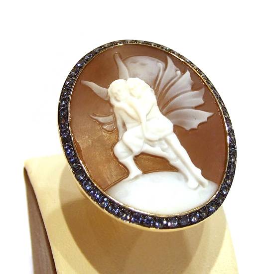 This ring is made of the company's own design for its unique cameo. It has blue sapphires embellishing around the high relief cameo which add more sparks to the ring to catch others' attention. It is made in 18K gold.