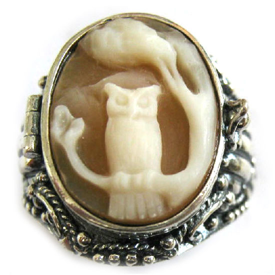 This is a shell cameo ring in a sterling silver setting. It is nicely carved with an owl on the tree at the front. Adorn your slender finger with this shell sterling silver ring.