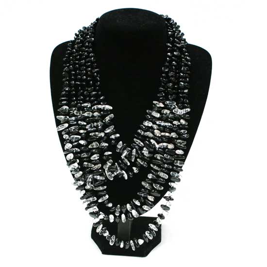 This fancy necklace is made with natural shells for a touch of unique style. The necklace comes in black and white, with irregular patterns suggesting a truly natural look. This necklace matches your casual dresses well with ease.