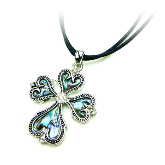 Showcased is a gorgeous pendant designed in a nice cross shape. The pendant is set with deep natural paua shells to give out fantastic colors. The embossed frame is adorned with clear crystal for additional glamor.
