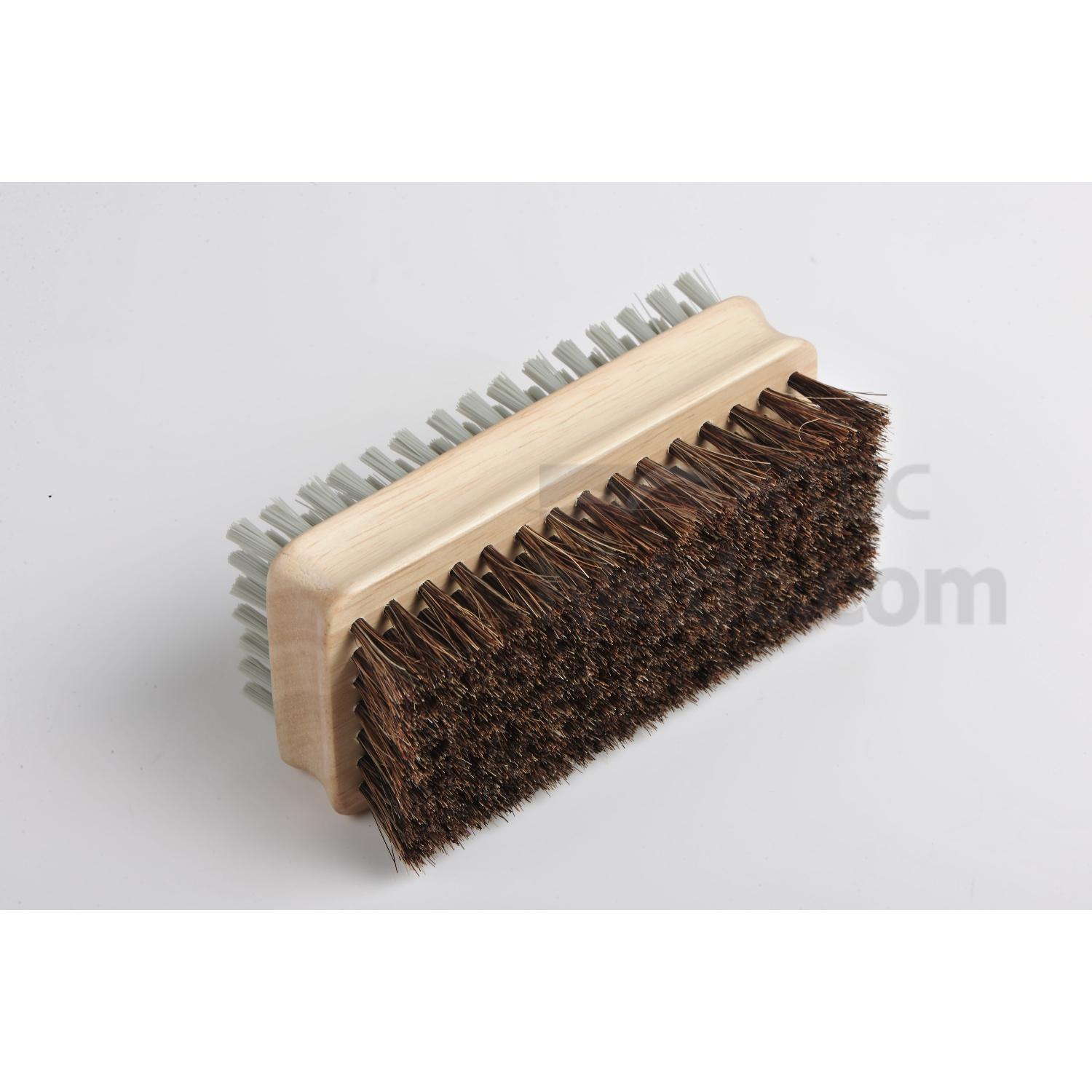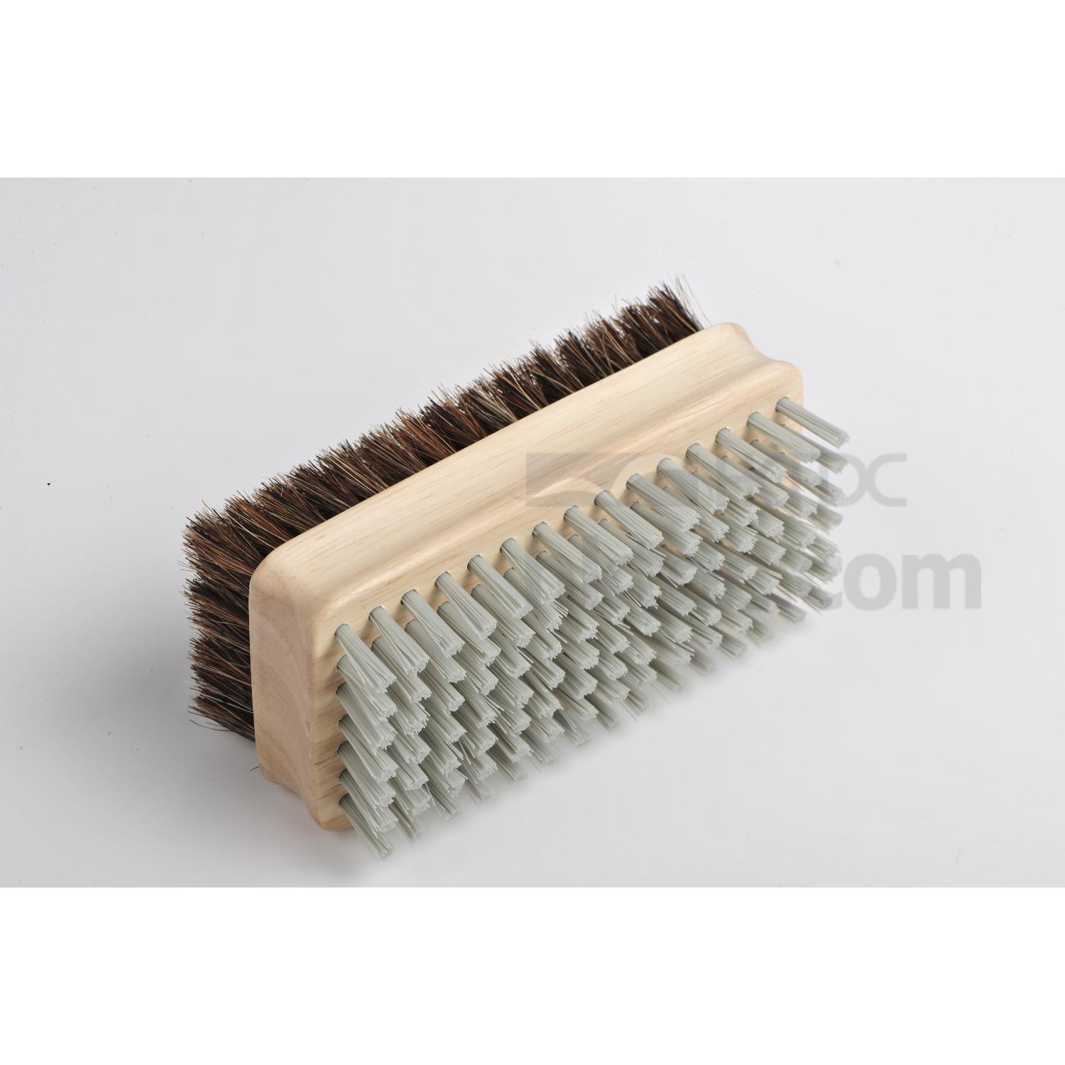 A showcased multifunction shoe cleaning brush is made of rubberwood, PBT bristle, and natural pig hair. It is 2 in 1 cleaning brush, including PBT bristles which can be used to clean cloth with water, and pig hair which can be used to care for the leather surface, also suitable for bag and cloth, etc.