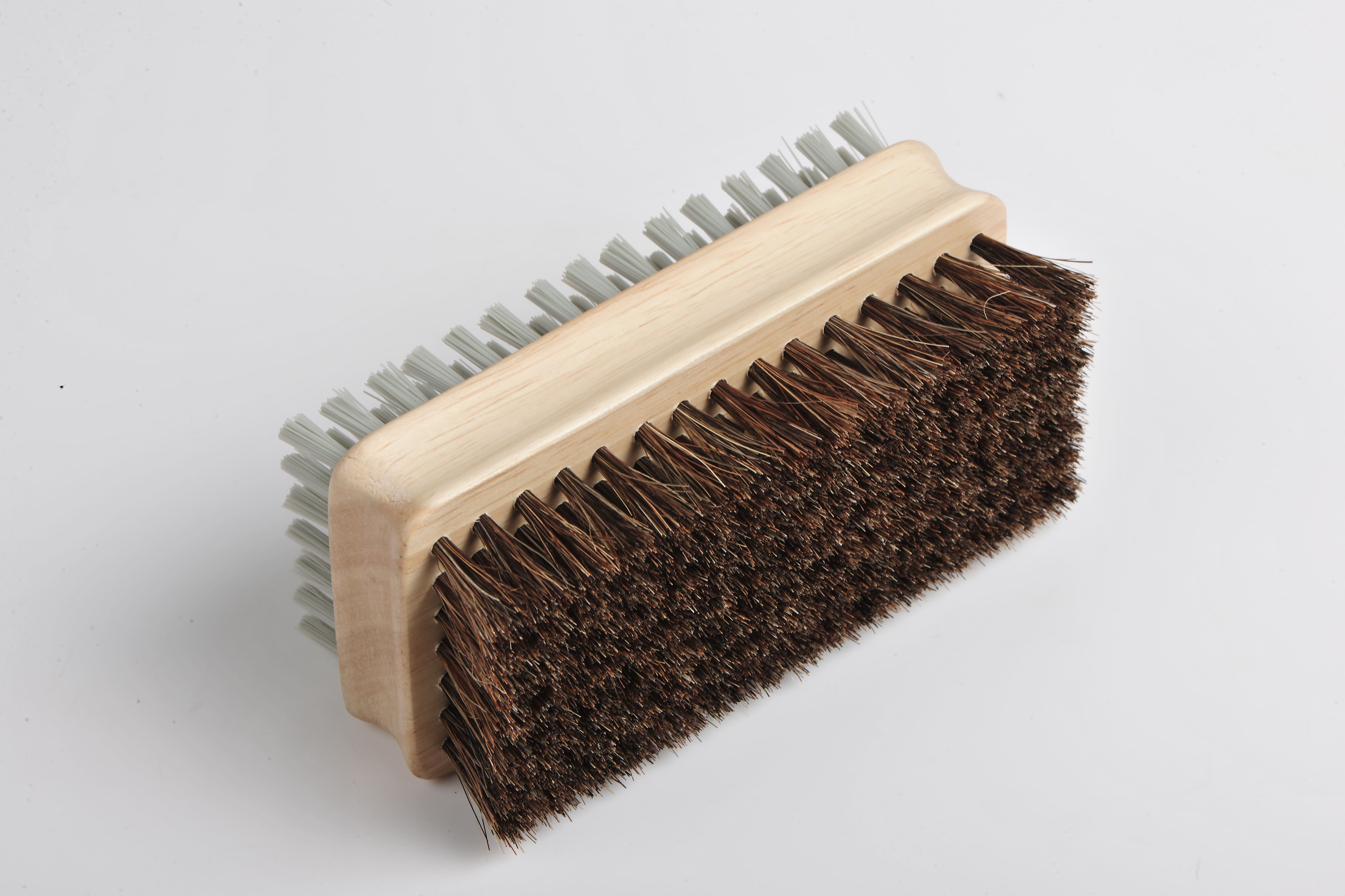 A showcased multifunction shoe cleaning brush is made of rubberwood, PBT bristle, and natural pig hair. It is 2 in 1 cleaning brush, including PBT bristles which can be used to clean cloth with water, and pig hair which can be used to care for leather surfaces, also suitable for bags and cloth, etc.