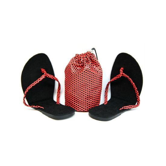 This set comes with a string bag and a pair of flip-flops. The bag comes in bright red with black dot patterns and a black string. The slippers feature black soles and red uppers with black dot patterns for a perfect match.