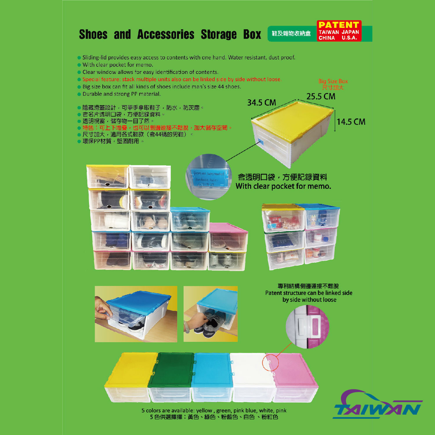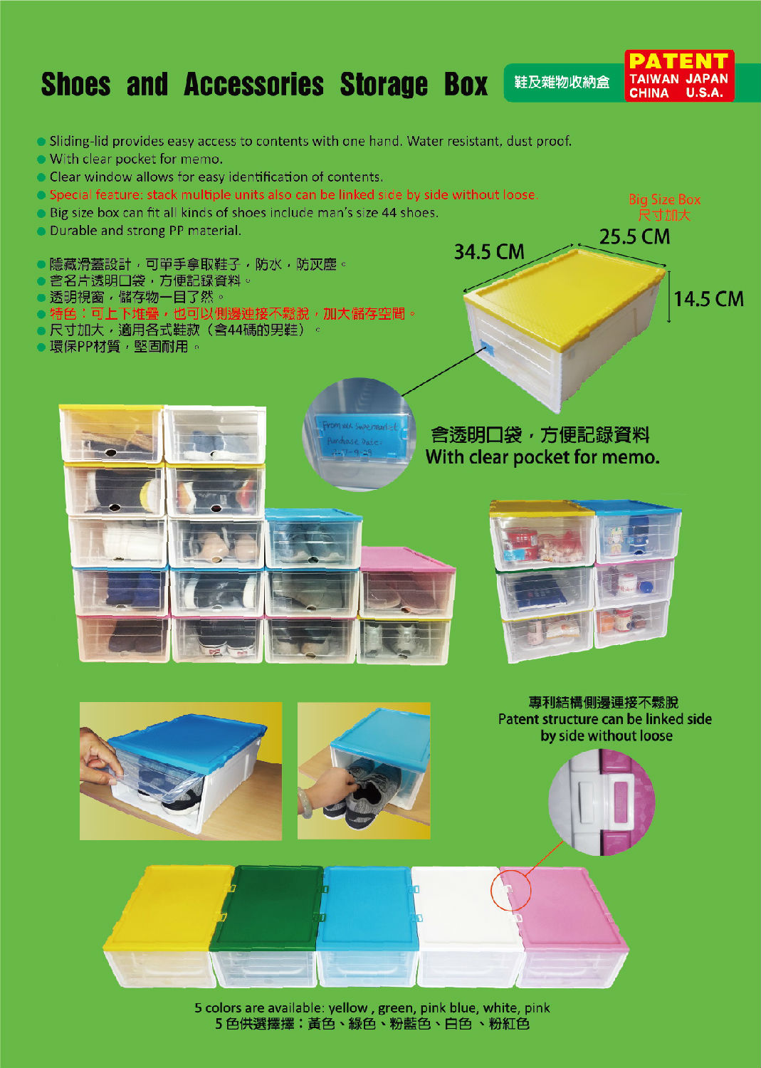 • The patent shoes and accessories storage box, can be linked side by side very securely, and has clear pocket for memo.