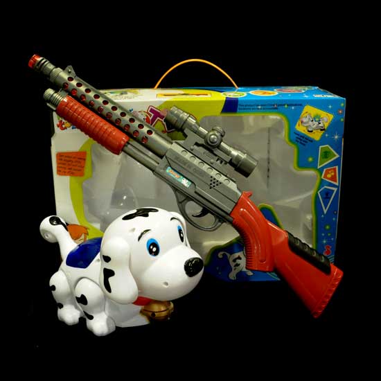 This shooter game set comes with a toy rifle and a toy cartoon dog. The ergonomic handle and realistic design of the rifle allow added fun and excitement. This shooter game set is suitable for children aged 6 years old.
