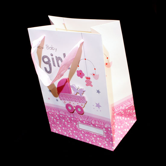Featured is a shopping bag designed to hold gifts for new-born babies. The shopping bag is well made with quality paper for a fine and durable structure. Customized logos and messages can be printed on the bag for personalized style.
