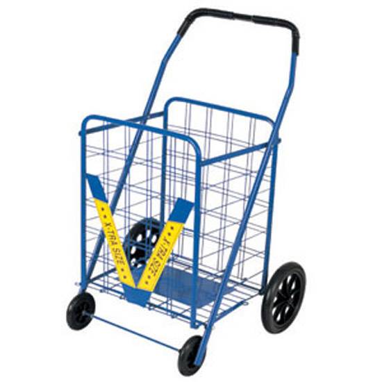 This shopping cart features a durable metal construction in blue. This easy-to-assemble personal shopping cart can be folded for storage. Transport your precious groceries and laundry with this folding shopping cart.