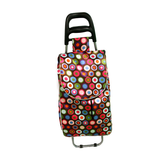 Featured is a shopping trolley bag with a rugged construction. The whimsical circular patterns easily capture attention. This shopping trolley bag offers a chic option to bring the groceries home.