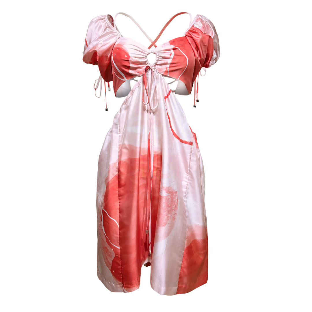 This luxury adjustable silk dress blends elegance and versatility, featuring a signature print and an innovative adjustable silhouette that adapts to your style. With transformable elements at both the waist and top, the versatile sleeves can be styled up for a structured silhouette or down for an elegant evening look.