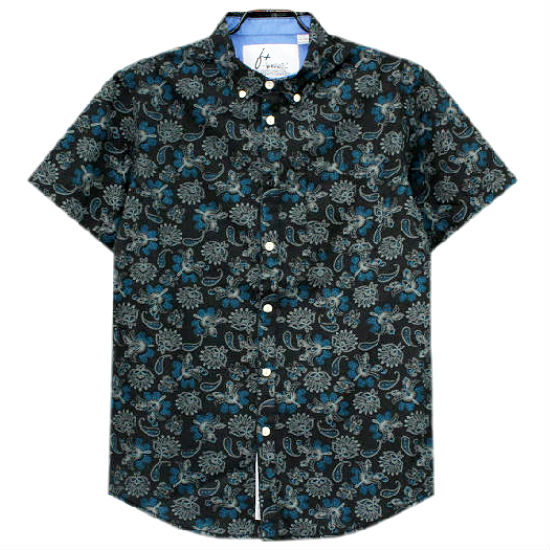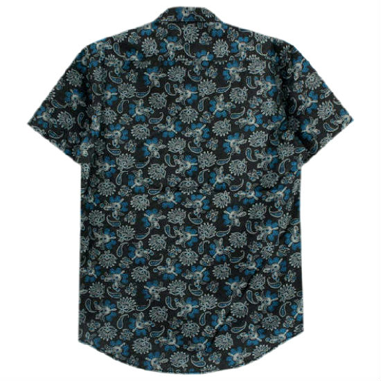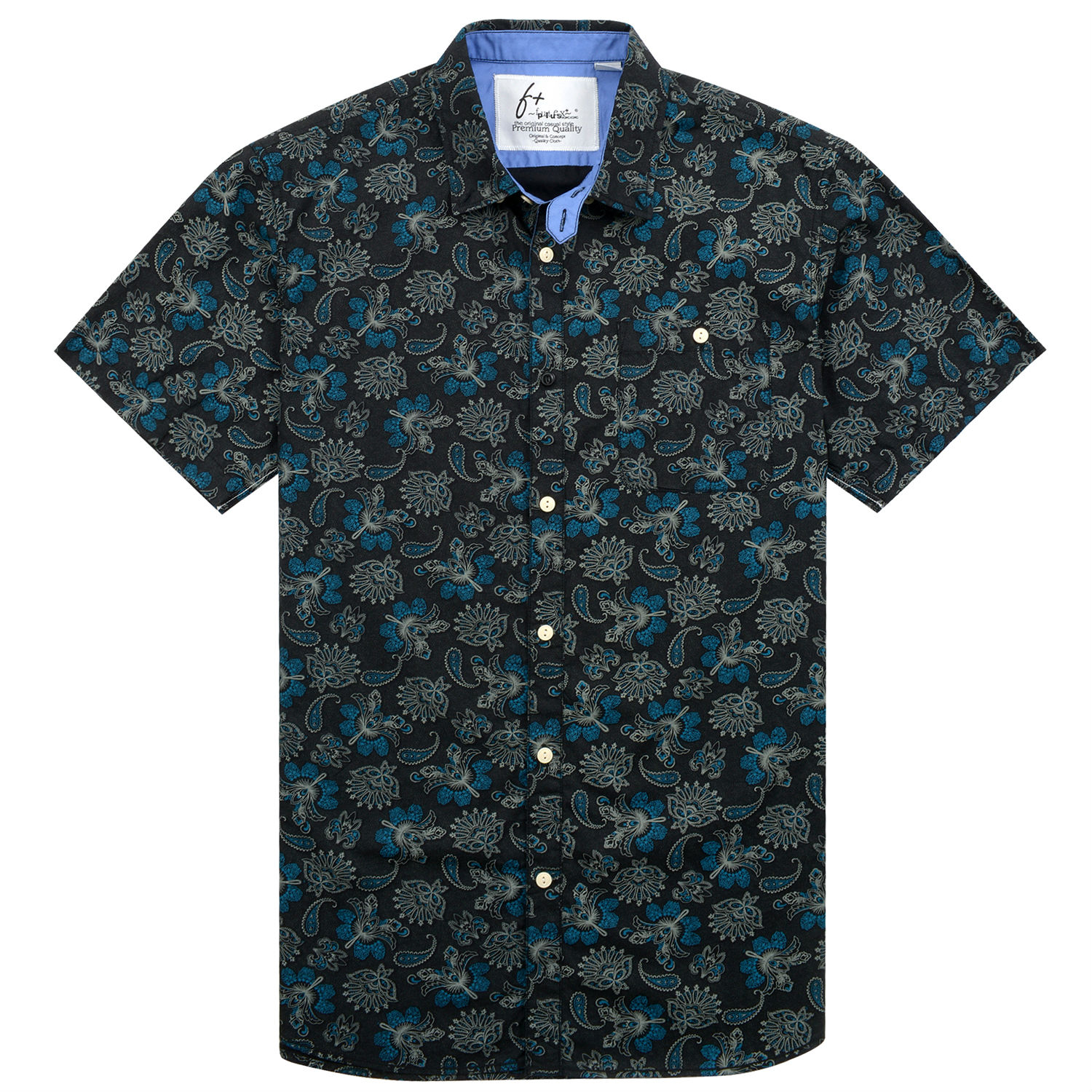 Printed button-up shirt. It has a regular shirt collar, a button-up front with decorative plastic buttons and short sleeves with stitched cuffs. The shirt is made from lightweight cotton fabric and boasts an all-over print. The shirt features a small patch pocket on the front and has a regular fit that falls to the hips.