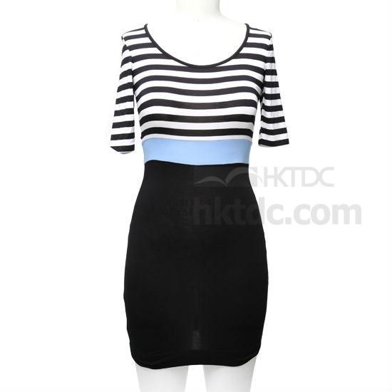 This lovely one piece dress features a tri-tone design. With black-white stripes on top, the waist is highlighted with baby blue panel. The form fitting bottom is designed in plain black color for a slimming effect.