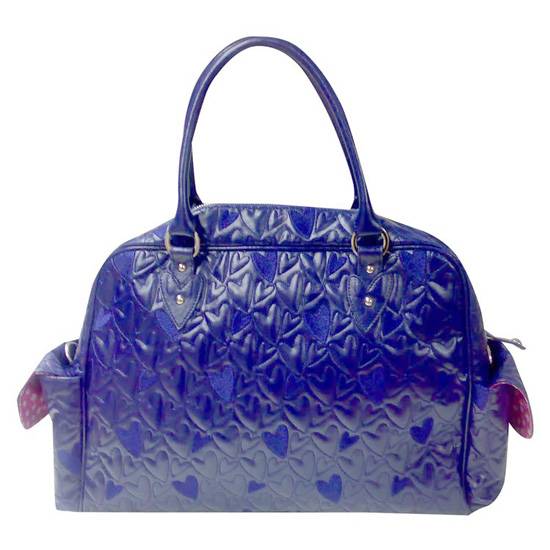 This is a shoulder bag made of thick plastic materials. There are different patterns of hearts densely embossed on the bag.