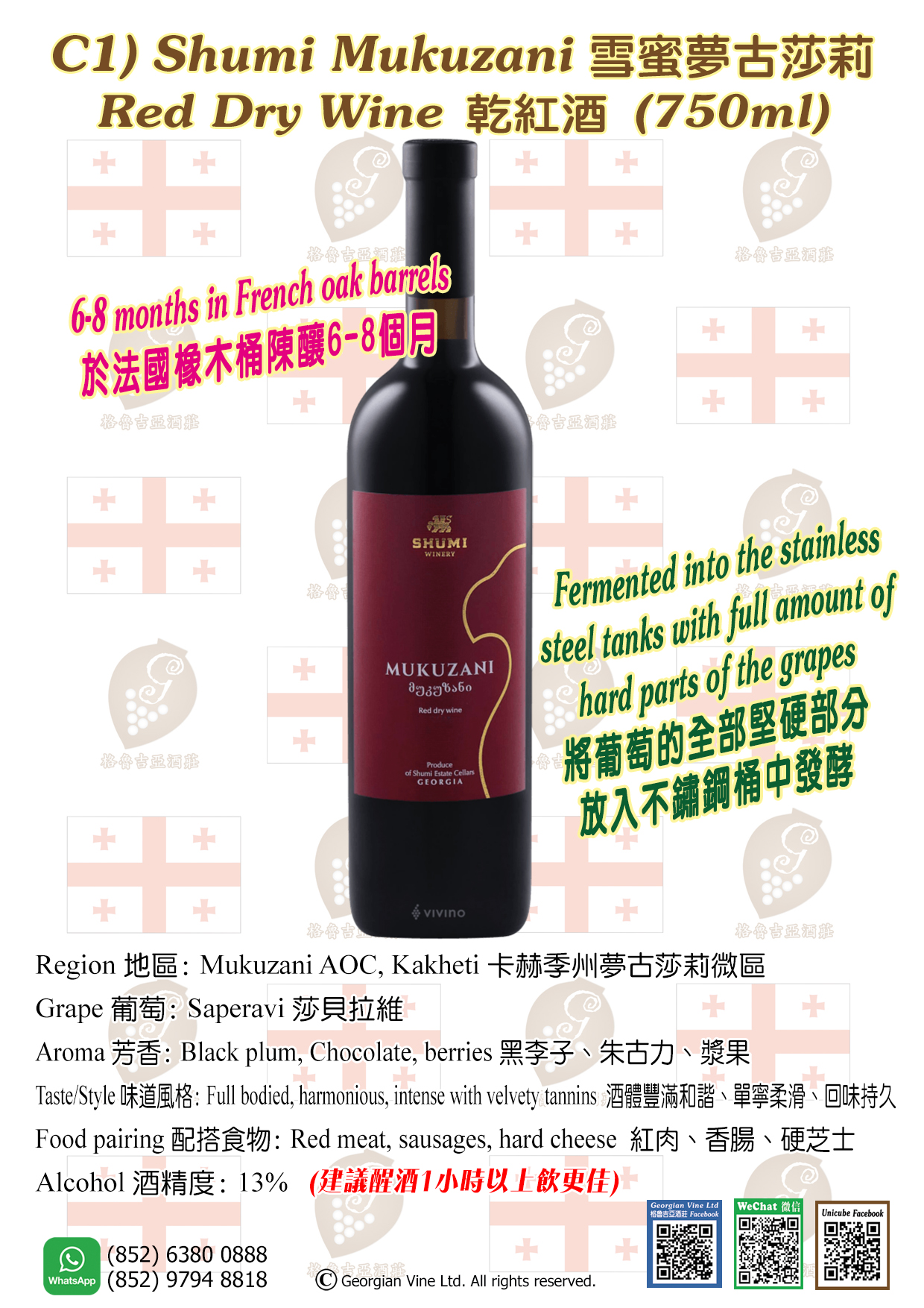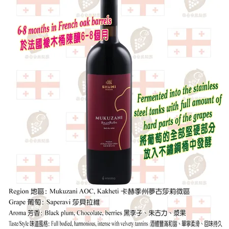 Mukuzani is the dark ruby colored wine has intense aromas of black plum and chocolate, with berry tones. It is a full-bodied and harmonious, intense with velvety tannins and rich, long-lasting aftertaste. Food pairing with smoked red meat, sausages and hard cheese.