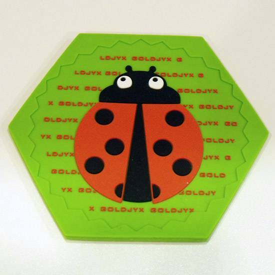 The hexagon cup mat features a funny embossed beetle. Made of silicon, it is durable and easy to clean. This anti-slip mat keeps your cup in place while adding style.