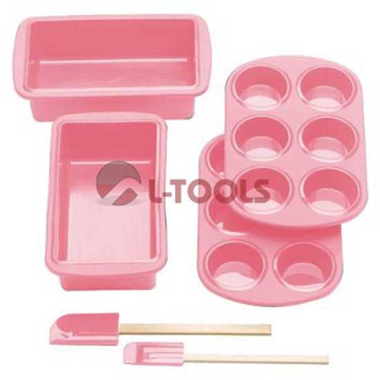The baking kit includes 2 muffin moulds, 2 loaf pans, a spatula and a spoon with a wooden handle. The set is made of durable silicone to withstand high temperatures. This kit is perfect for anyone who wants to create scrumptious home-baked goodies.
