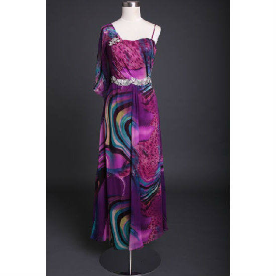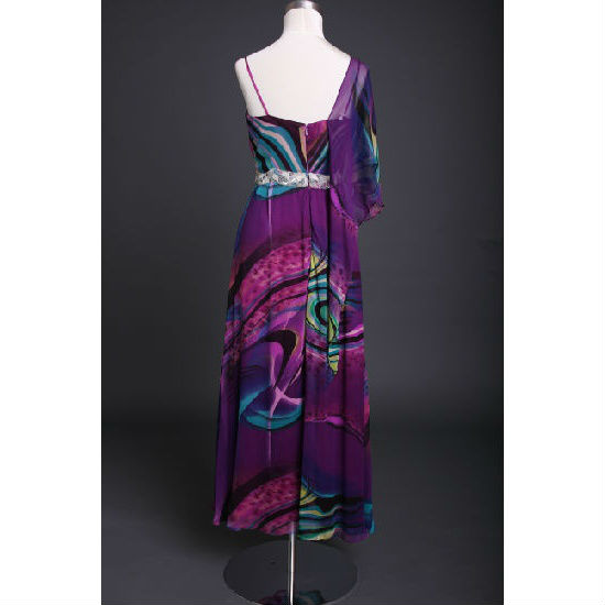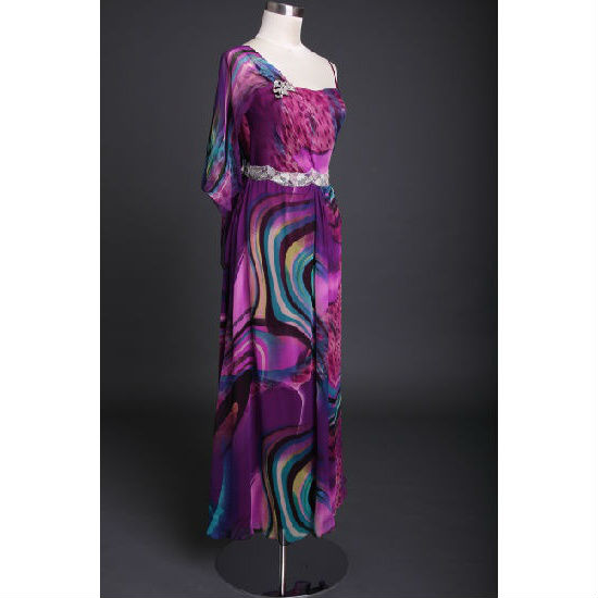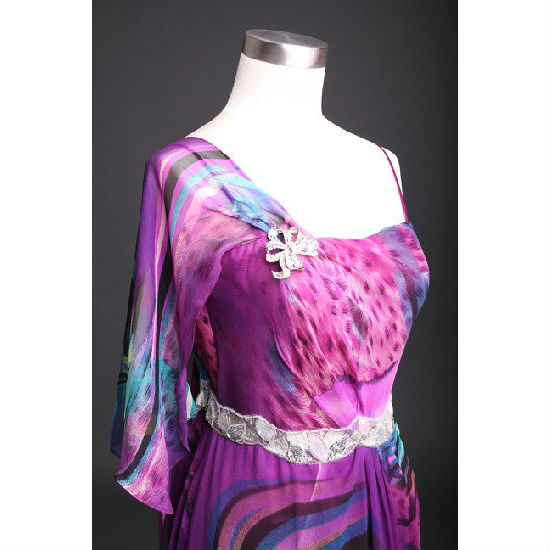 This silk evening gown relaxed shape with cascading kimono sleeves and flared skirt that falls all the way to the floor. Crafted from hand printing silk fabric, it flows over your body lending lightness and fluidity to your movements.