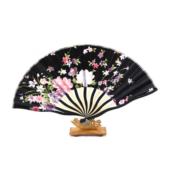 This foldable silk fan comes with captivating floral patterns on the black pleats. The curving black and white frame exudes a characteristic touch. This appealing silk fan makes an ideal decoration for your home.