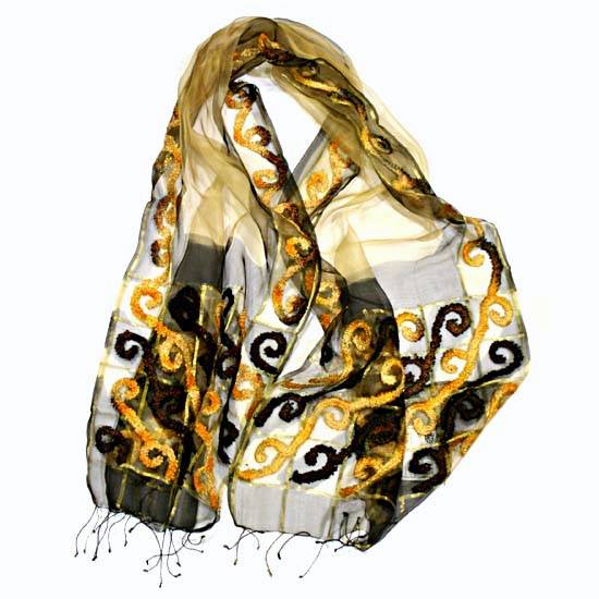 This gorgeous multi-color scarf features swirl patterns all over. The sheer design and golden thread showcase a touch of sophistication. It comes with fringes on both ends. This beautiful scarf is a stylish way to add color to your favorite outfits.
