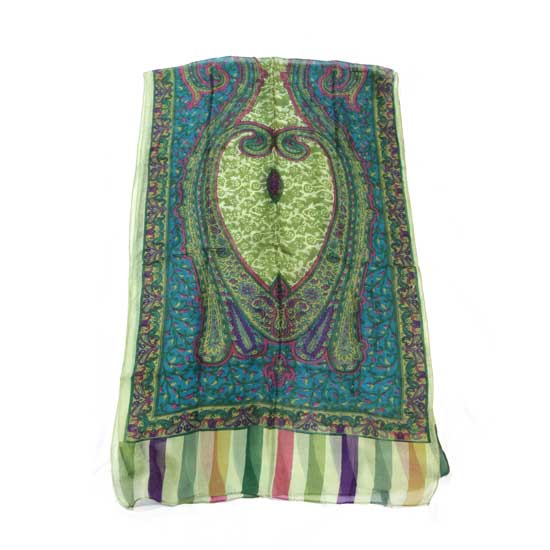 This is a silk scarf with a charming and eye-catching design. It is printed with amazing and exquisite patterns in assorted colors. The ends are crafted with colorful vertical stripes for added uniqueness.