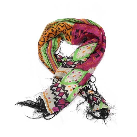 This scarf features a smooth and soft texture for enhanced comfort. It is printed with colorful and charming patterns in assorted bright colors. The ends are adorned with black tassels, adding a unique touch to this design.