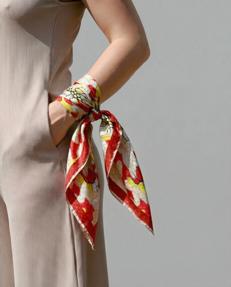 AY Silk Scarf is a contemporary silk accessory created from archived textile designs of Isesaki Meisen, a historic Japanese silk weaving culture that flourished over 100 years ago in Gunma, Japan.