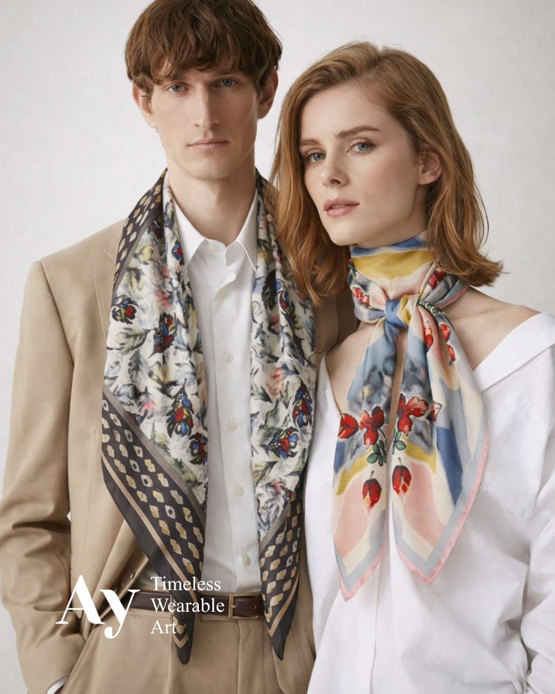 Through digital archiving and modern textile technology, we revive these vibrant historical patterns and reinterpret them into elegant silk scarves for modern life.
