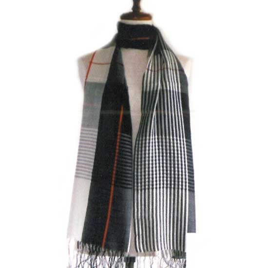 This is a silk and wool scarf that is accented with classic checkered patterns. It is soft and comfortable to the touch. This fashionable scarf is easy to pair with your outfit.