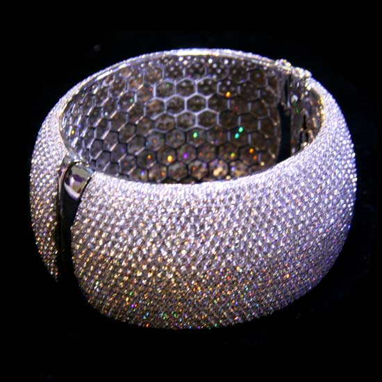 The bangle is delicately crafted with sophisticated details. The bangle features a wide-band design encrusted with shimmering stones for an elegant touch. This bangle makes a pretty way to enhance your fine jewelry collection.