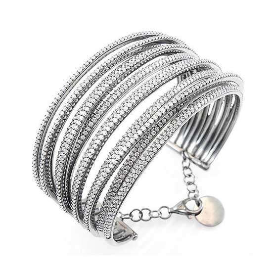 This is a silver bangle that is designed with multiple circles for a unique and trendy appearance. It is made of high-quality silver and masterly paved with sparkling CZ stones. This trendy bangle is an ideal accessory for highlighting your look.