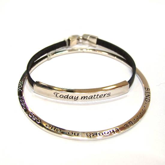 These bracelets are designed with interesting sentences. One of them bears the simple words "Today matters", while the other one says "Sing......as though no one can hear you." These catchphrases may well reflect the relaxing and causal personality of the owner.