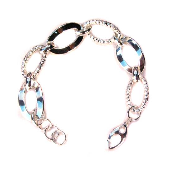 This bracelet features six oval-shaped silver pieces. Among them, three are equipped with smooth diamonds. The ones with diamonds and the ones without alternatively show up along the bracelet. Each of them is held with the one next to it by a clasp. The diamonds are certainly reflective, but the ones without diamond also reflect pretty well.
