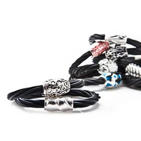Featured here is a bracelet made of twisted rubber and comes with silver parts. The bracelet gives an edgy style through the strong contrast of black and silver. The silver part can be made in high-polish silver, enamel silver, antiqued or matt silver for your option.