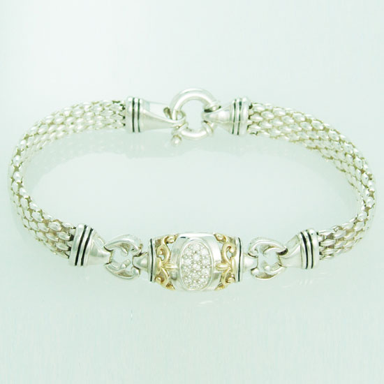 Highlighted here is a gorgeous silver bracelet with cutout yellow-gold accents. The fleur-de-lis motifs add distinction and individuality. This silver bracelet makes a grand addition to your jewelry collection.