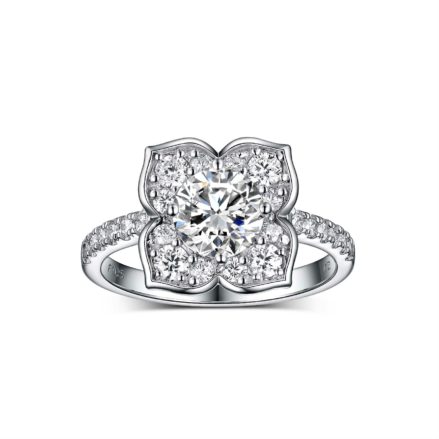 This sterling silver ring is plated with rhodium and is embellished with cubic zirconia stones. It has a four-petal flower shaped setting with a white round cubic zirconia center stone and has a slim band paved with smaller stones. The sterling silver ring flaunts outstanding workmanship and is an excellent gift for ladies.