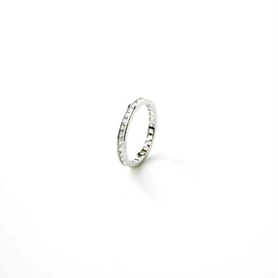Here comes a slim design of silver ring which features the princess cut of CZ stones. The stones are firmly held on the bordering row for a glamorous look. The lustrous and fashionable look attached with the power of beauty, this ring surely gives you a surprise at the first sight.