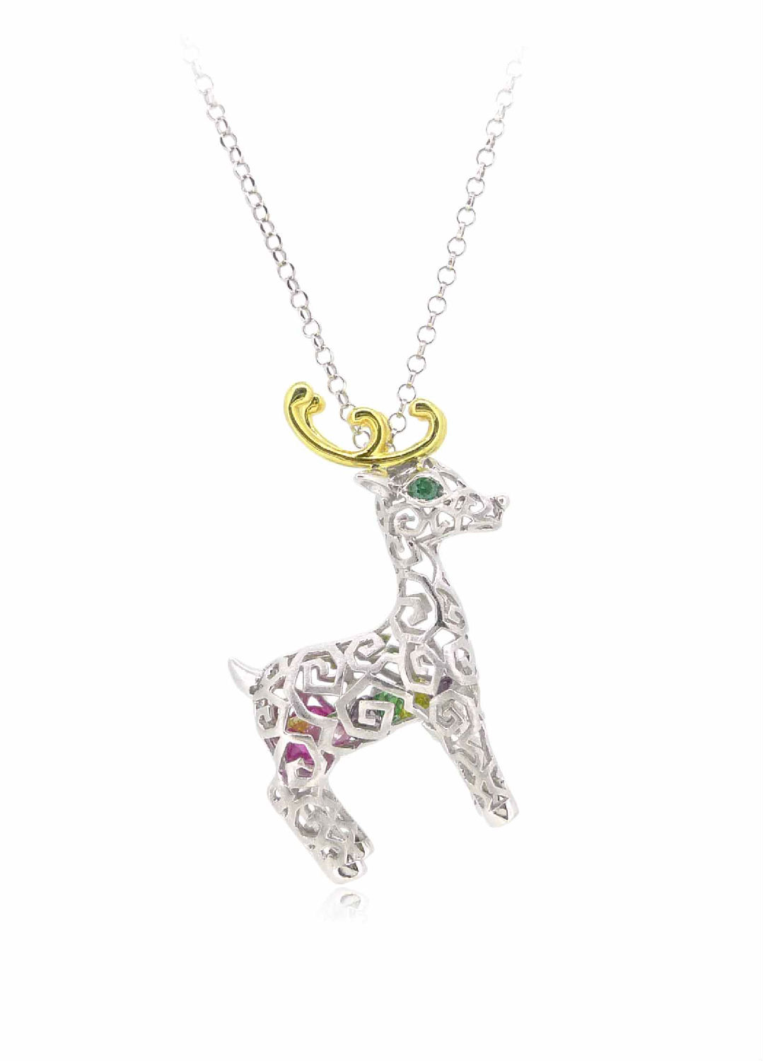 This silver pendant is like a Christmas Deer, the famous icon in Christmas. The Christmas Deer’s body is made with our brand’s special texture. We set the green Swarovski stones in the eyes and also put in many colour of small crystals inside the body. When you shake the deer, all the small crystals will move vividly and Bling-bling!