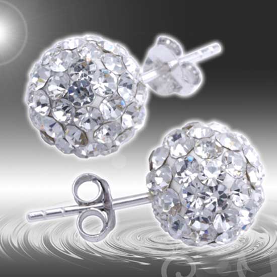 Displayed is a pair of silver earrings with a studded ball silhouette. Round faceted crystals are lodged in to give enchanting brilliance in whatever rotation. Frame your face with