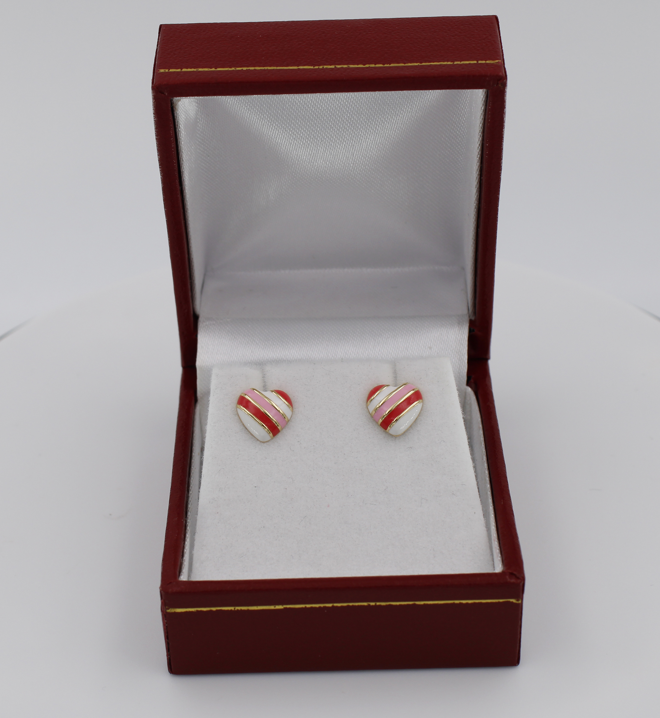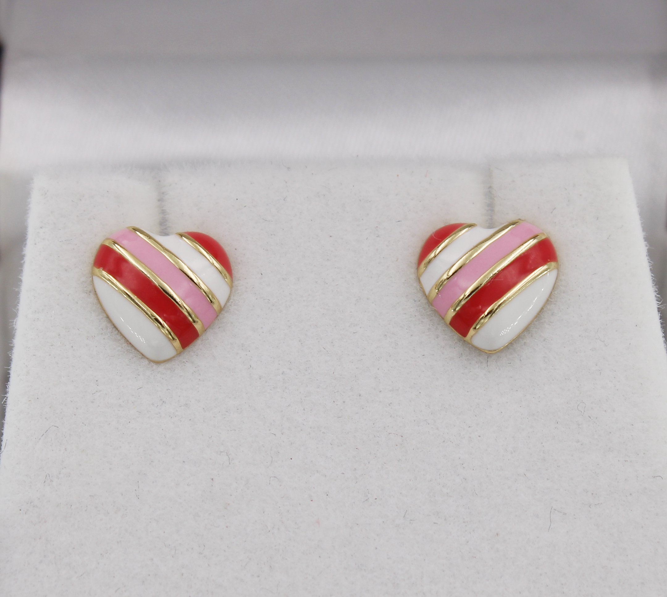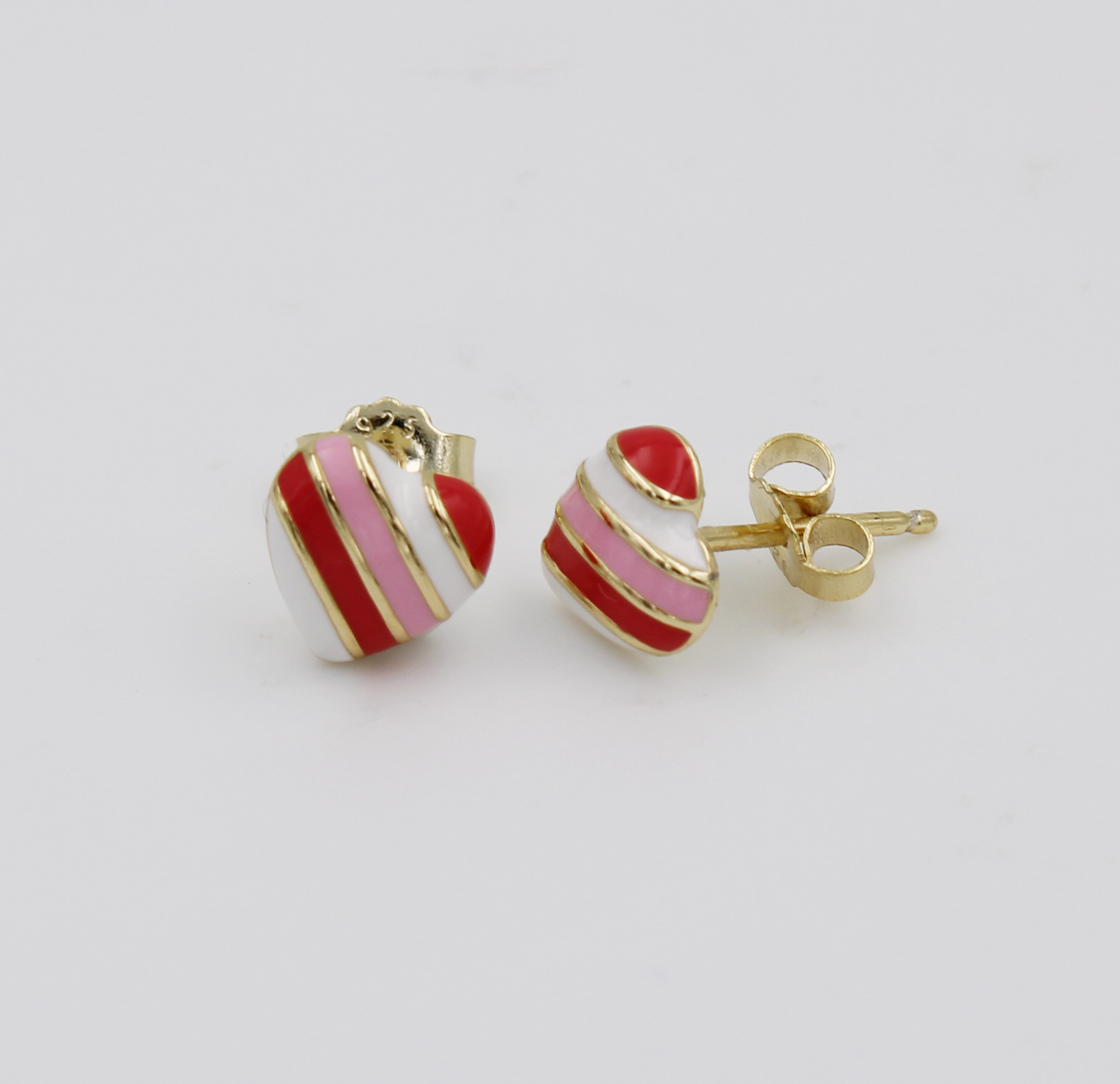 925 sterling silver stud post earring with 1pr. of 7.5mm heart shape enamel pattern in white, pink and red color on them.