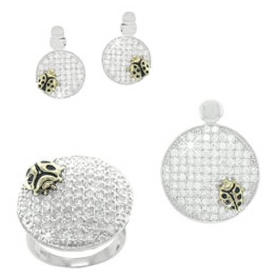 This is a silver jewellery set which includes a pair of earrings, a ring and a pendant. The jewellery are decorated with white sparkling stones.