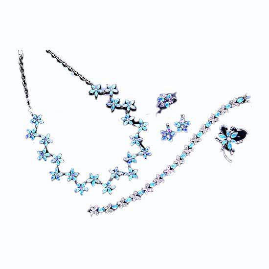 This silver jewelry set gives out a special feeling with its floral design. The blue stones offer an elegant yet lively style. The fashionable jewelry items look great separately or as a set.