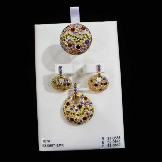 This silver jewelry set comes with a sophisticated design. The jewelry set is well plated with gold and accented with glittering gemstones, showcasing a beautiful touch. They are perfect for grand occasions.