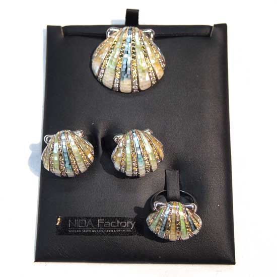 This exquisite silver jewelry set features an attractive seashell design. The ring, necklace and earrings are studded with twinkling white CZ stones for added appeal. The stylish silver jewelry set will greatly enhance the beauty of the wearer.