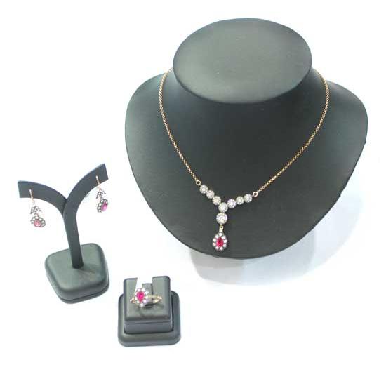 This three-piece jewelry set includes a necklace, a ring and a pair of earrings. Crafted of fine silver, the jewelry pieces are adorned with twinkling pink and white CZ stones. The elegant jewelry set is perfect to accessorize an evening dress.
