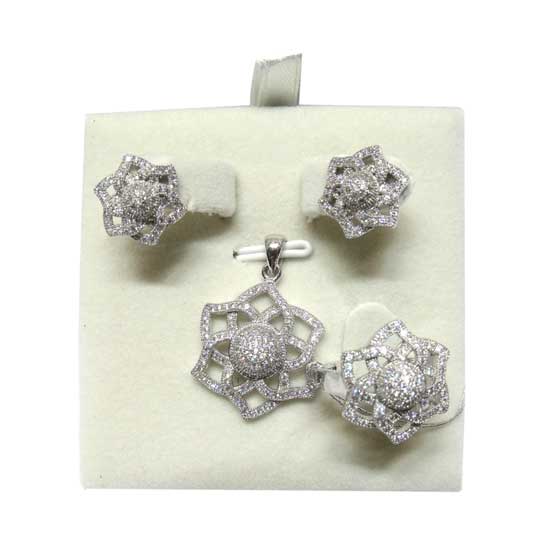 This gorgeous jewelry set includes a finger ring, a pair of earrings and a pendant with a matching design. Each jewelry piece features paved CZ stones to create a lovely and colorful floral design. This delicate floral jewelry set is the combination of style and taste.