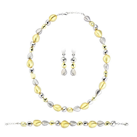 This is a jewelry set made of plain silver. It comes with a necklace, a bracelet and a pair of earrings. The two-toned design showcases a touch of uniqueness and style.