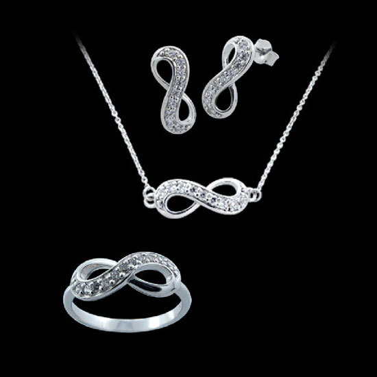 This is a silver jewelry set that includes a pair of earrings, a finger ring and a pendant. The allover dazzling CZ stones add a touch of style to all the pieces. This jewelry set pairs with your outfit easily.