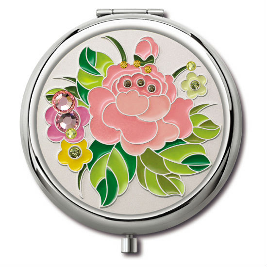 Round shape.   Embossed flowers pattern in colors with enamel painted and color stones.
