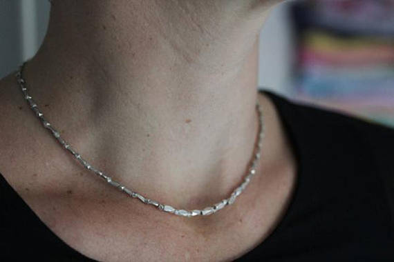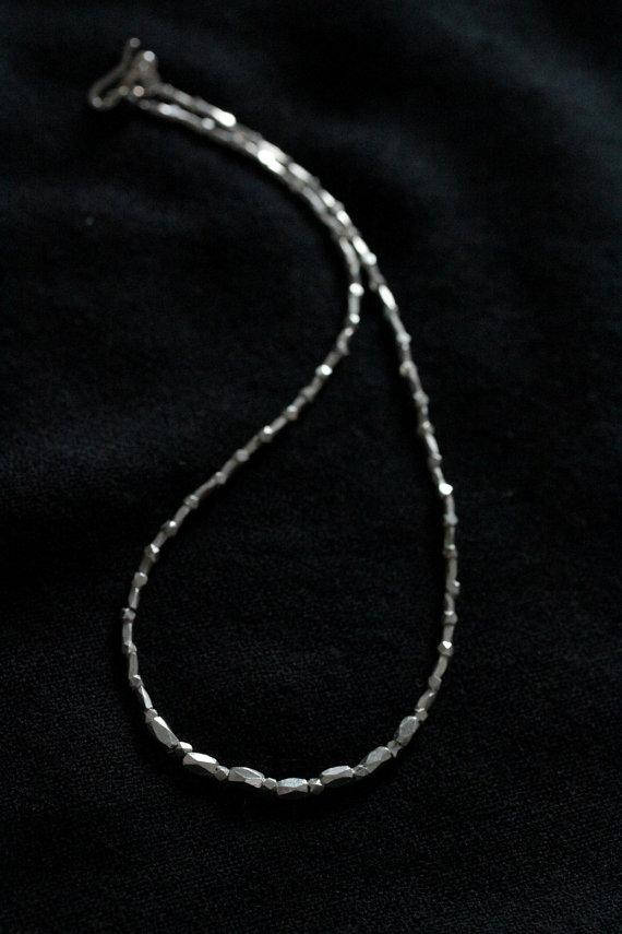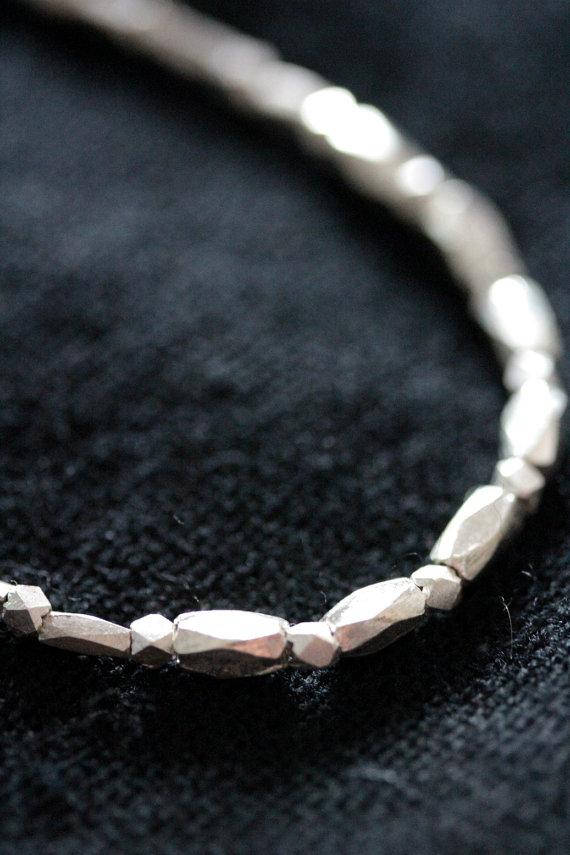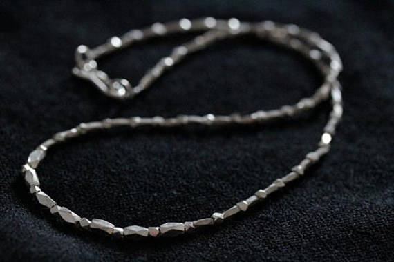 The necklace is made of faceted handmade diamond-shape pieces, separated by smaller silver grain beads. It closes with a simple silver hook.