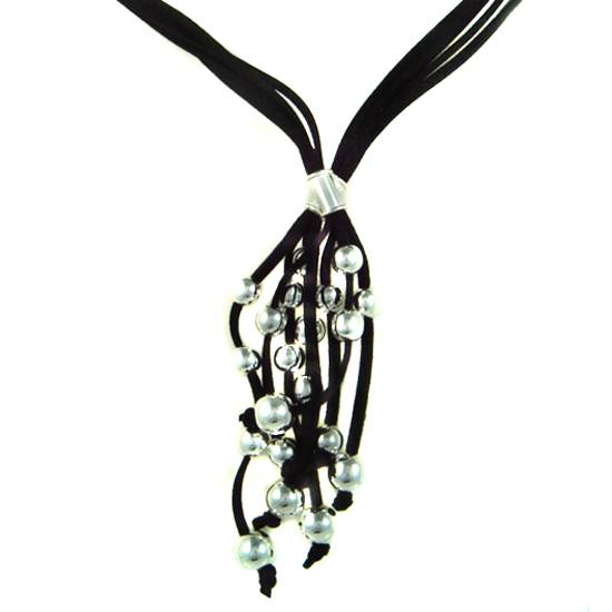 This necklace consists of numerous silver balls as its pendants. Several black stripes are tied together to serve as the chain. The silver balls are tied at the end of the black stripes. The pendants are quite romantic to look, because the silver balls resemble rain or snow falling from a dark sky.